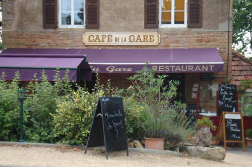 Gisteravond was ik al even met de fiets zonder bepakking met licht op het dorp ingereden. Een leuk dorpje, waarvan er vele zijn in Frankrijk. Nu ga ik vanmorgen nogmaals het centrum in om een bakkie, koffie in een klein kopje, te doen bij Café de France, Franser kan het niet zou ik zeggen. Vanaf dit dorp is door de overheid een fietsroute (voies vertes) gemaakt helemaal naar Mâcon. Deze gaat deels (8 km) langs een kanaal, verder voor het grootste deel over oude spoorwegen en wat rustige weggetjes.