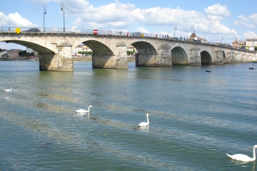 Nog even de voie bleue naar Mâcon over het fietspad dat boven het water van de Saône is gebouwd en onder de Pont St. Laurent doorgaat. Even zitten op een stenen zetel aan de promenade langs de rivier en daarna een jus d′orange in de schaduw op een terras met uitzicht op de Saône.