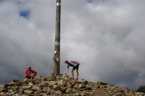 Voorbij Foncebada staan stalen palen langs de weg. Dit is om de weg te markeren als er ´s winters sneeuw ligt, zoals je ook in Oostenrijk wel ziet. Richting Cruz de Ferro regent het zo nu en dan. Vlak bij het ijzeren kruis is het even droog. Een Française neemt op mijn verzoek een foto van mij als ik de steentjes van Joke bij de voet van het kruis neerleg. Voorbij dit gedenkwaardige punt gaat de weg zo nu en dan nog stukjes betrekkelijk stijl omhoog, afgewisseld met afdalingen. In Marjarin is een soort refugio-café. Ik kijk even binnen. Het ziet er mij te harie-bombarie-religieus uit. Allemaal heiligenbeelden en kralenkettingen. Het spreekt mij niet aan. Ik ga door. Als het echt bergafwaarts gaat wordt het steeds slechter weer. Het regent en ik rij in de wolken. Mijn bril wordt nat en het zicht daarmee nog slechter. Ik voel me niet senang (in de wolken) hierbij. Ik gebruik veelvuldig de remmen.