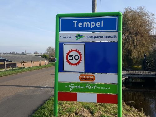 Het dorp Tempel (Gemeente Bodegraven-Reeuwijk) is niet genoemd naar een gebedshuis. Op internet staan verschillende ideeën waar de naam Tempel vanaf geleid zou kunnen zijn. Eén van de mogelijkheden is dat er hier een kleine veenstroom met die naam was, die uitmondde in de Gouwe. Er wonen een kleine 200 mensen. In dit dorp zie je nog bovengrondse elektriciteitsdraden langs de smalle doorgaande weg. Een monteur is hier met een hoogwerker aan het werk. Wij maken een praatje met hem.