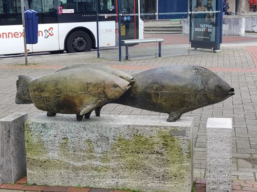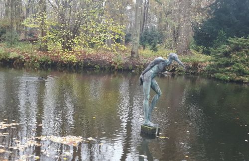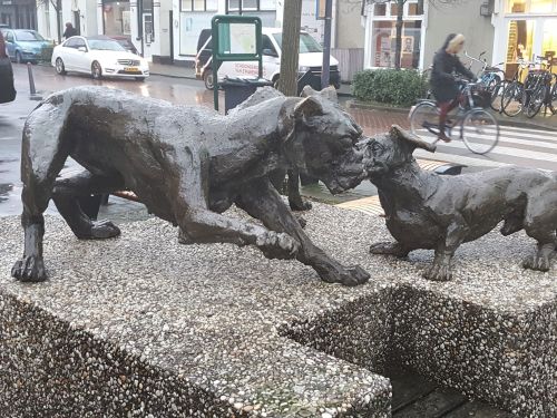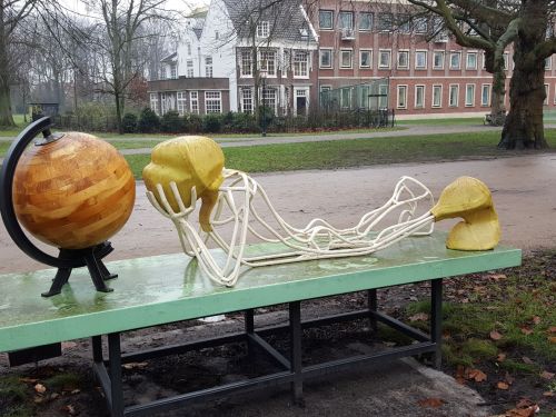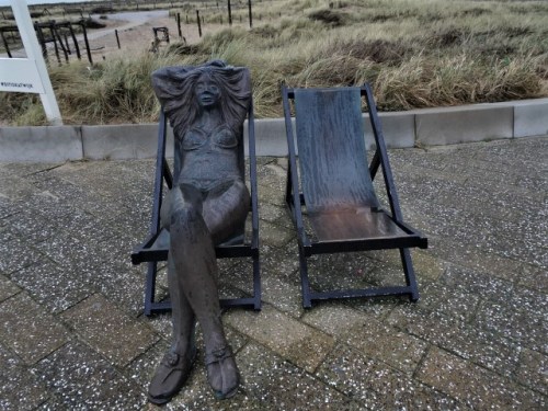 Bert en ik zijn op de fiets onderweg richting Den Haag. We volgen vanaf Noordwijkerhout de LF Kustroute. We rijden vooral op fietspaden. Op de boulevards van Noordwijk en Katwijk is het heerlijk rustig. Dat is niet zo vreemd. Alle horeca is gesloten in verband met de corona. In de duinrand tussen de weg en het strand staan in de dorpen Noordwijk aan Zee en Katwijk aan Zee redelijk veel beelden. Ik maak een foto van Vrouw in ligstoel/ Rebecca van de kunstenaar Guido Metsers.