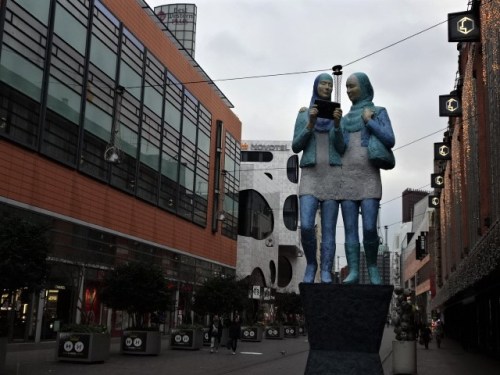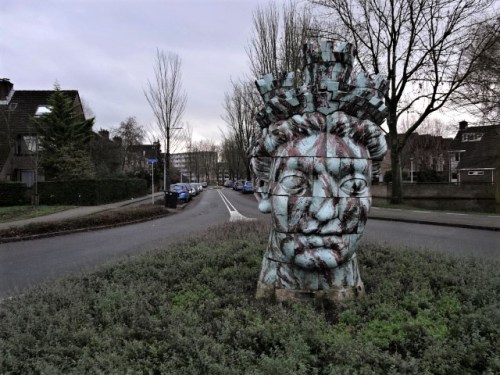 We pakken ook nog een stukje binnenstad van Den Haag. We passeren de Grote Markt, normaal druk met gezellige restaurantjes. Op het dichte pand van de Bijenkorf staat een grote 150. Dit omdat dit luxe warenhuis dit jaar 150 jaar bestaat. Bij Station De Vink staat een beeld van het hoofd van de Griekse Godin Sibylle.