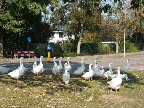 Eerst thuis koffie drinken. Dan om 9.30 uur op de fiets de Haarlemmermeerpolder in. Rijnsaterswoude ligt aan de Braassemermeer. Dan door de dorpen Ter Aar en Aarlanderveen. Bij Zuidhoek zijn we in het gebied van de Nieuwkoopse Plassen. We nemen het Meijepad. Dit kerkpad is nat en er liggen boomblaadjes. Een mevrouw die voor ons rijdt maakt een schuiver. Piet gaat ook onderuit, maar mankeert niets. De vrouw bloedt hevig uit een wondje aan haar voorhoofd. Haar man belt 112. Als een dame die in de buurt woont voorstelt om de ambulance aan het begin van het Meijepad op te vangen, gaan wij verder.