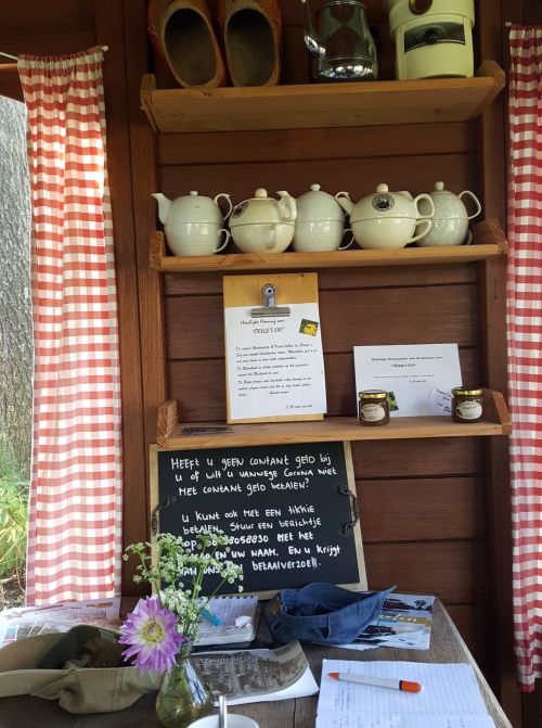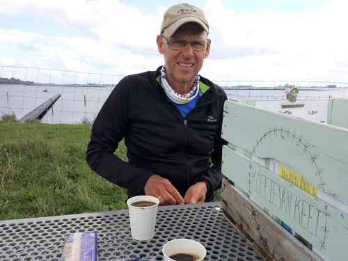 Een dijk waarop een fietspad is afgesloten. Aan het begin staat een bord dat aangeeft dat je hier niet in mag of kan rijden. Een stukje verder staat een enorme graafmachine. Die blokkeert het pad van links naar rechts. Links is een kanaal en rechts een behoorlijk talud. Het is weekend. Dus zijn er geen werkzaamheden vandaag. We gaan het maar proberen. Via het talud komen we lopend met de fiets voorbij de graafmachine. Het kost wel veel moeite om weer omhoog op het fietspad te komen. Een kilometer verder aan het eind van de dijk is een bankje. Hierop staat een kistje met het opschrift Koffie van Keet. Er staat koffie in thermoskannen in. Ook zijn er koeken en frisdrankjes. De kosten kunnen worden afgerekend door geld in een glazen jampot met deksel te doen.