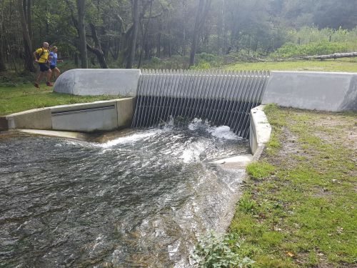 Wandelen in de Amsterdamse Waterleidingduinen. Vandaag gaan we bij Oranjekom het duingebied in. Niet zoals meestal even een bakkie doen, maar direct aan de wandel. We volgen de oranje route. Al snel lopen we langs een smal kanaal met een betonnen bodem. Het water is erg helder. Vissen zien we vandaag echter niet. Het kanaaltje gaat over in een waterval daar waar het water door een duiker van anderhalve meter doorsnee gaat.
