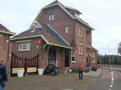 Nu zijn we niet meer op de Zuiderzeeroute. Koffie drinken we vanmorgen in Lage Vuursche in een restaurant, waar ooit Gerrie Kneteman eigenaar van was. We fietsen langs het kleine station Hollandse Rading. Bij Nieuw Loosdrecht ligt een vliegveldje. Aan de andere kant van de weg is een kazerne met een stormbaan in de ‘tuin’.