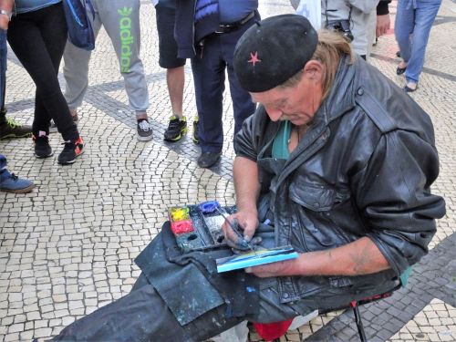 Evenwijdig aan de Taag wandelen we daarna terug richting Lissabon. We komen langs het Elektriciteitsmuseum, waar Joke en ik een aantal jaren geleden een bezoek aan brachten. Nu is er nog een ander technisch museum naast gebouwd. We lopen onder de brug over de Taag door. Waar vroeger havenactiviteiten plaatsvonden zijn nu soms grote pleinen waar auto’s worden geparkeerd of waar kleine kinderen spelen op loopfietsjes en dergelijke. Ook komen langs een parkeerterrein met niet al te deftige caravans waar waarschijnlijk semipermanent of permanent wordt gewoond.