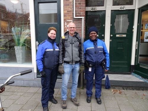 In de Bergse Dorpstraat gaan we voor een kopje koffie een ouderwets dorpscafé binnen. Als wij langs de ober lopen, vraagt of wij voor een bakkie komen. Dat vraagt hij later ook bij andere gasten die het café betreden. Het is tussen 10 en 11 uur in de morgen, koffietijd. Via het Oude Noorden lopen we richting het stationsgebied. Er staat een bus van de KNVB niet ver af van het Centraal Station. Vanavond speelt het Nederlands Elftal in Rotterdam tegen de Fransen. Ergens onderweg worden we aangesproken door twee boa’s. Zij vragen of wij het nummer weten wat we in Rotterdam moeten bellen als er een stoeptegel los ligt. Ze geven ons een kaartje met telefoonnummers.