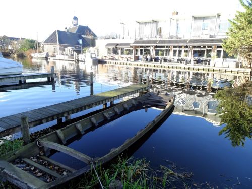 De brug In Hoogmade wordt gereviseerd. We doen hier een bakkie koffie bij Café Restaurant De Kromme Does. Daarna lopen we op een smalle grasdijk langs de Does. Eerst langs woonarken, dan langs voetbalvelden en daarna langs weiden.