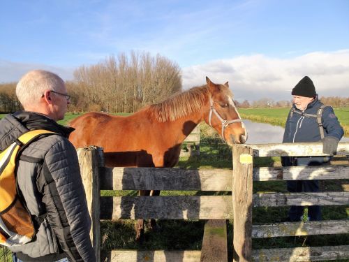 We komen op een ander grasdijkje. Er zijn hier meerdere overstapjes. Als we weer over een hekje klimmen komt een paard een kijkje bij ons nemen. Piet lokt hem weg, om te zorgen dat ook Leo en Margo aan de andere kant van het hek kunnen komen. Bij Klein Giethoorn staat de auto.