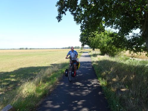 We reden een aantallen uren naar het westen. Nu fietsen we naar het noordwesten. Zo nu en dan komen we mensen tegen die net als wij de Oder-Neisse-Radweg volgen. Sommige hiervan komen we meerdere keren tegen, soms met één of twee dagen tussenpoos. Meestal groeten we elkaar dan door een handopsteken of door elkaar goedendag te wensen. Eén daarvan is een man in een rood met blauw fietsshirt.