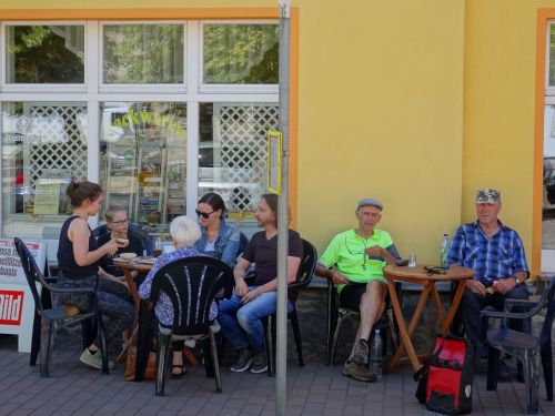 Weer lekker zonnig weer vandaag. We krijgen te maken met een wegomleiding. Daarom zijn we niet na 21 km in Gartz maar eerst na 26 km. In Gartz gaan we aan de koffie bij een bakker. Meestal is dat voor Bert een koffie zwart en voor mij een cappuccino. Dat is vandaag ook zo.
