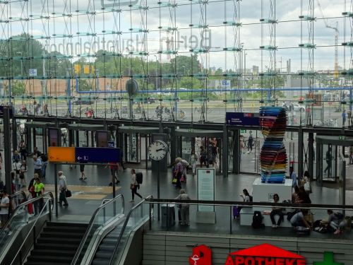 Onze trein is op tijd in Berlijn. We hebben 20 minuten overstaptijd. Dat moet toch voldoende zijn. Nou nee dus. Het duurde zolang voordat we met de lift meekonden, dat we de aansluitende trein naar Brandenburg missen. We hebben nu een klein uur de tijd om Berlin Hauptbahnhof nog eens te bekijken en een kop koffie te drinken. Omdat het niet zo vroeg meer is passen we de planning voor de eerste dag aan. We stappen uit in Potsdam en fietsen vanaf die plaats naar onze eerste camping. We eten bij een Italiaans restaurant dat eerder de naam Hollandse Molen had en nu Bella Vista heet.