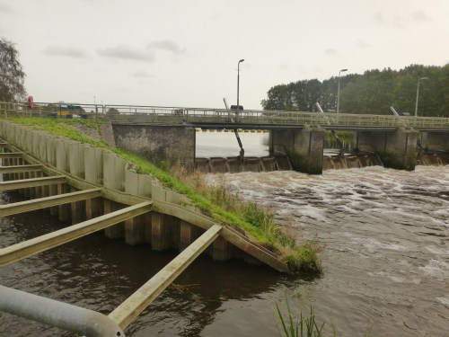 Sluis bij Holt in de Overijsselse Vecht. Hier is camping ‘De Stuwe’ en hotel ‘Mooirivier’. Aan de doorgaande weg is een bushalte. Ik hoef maar twee minuten te wachten voordat de bus langs komt en mij meeneemt naar het treinstation van Dalfsen.
