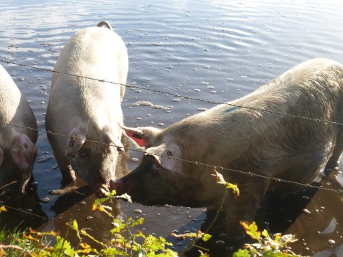 Aan de andere kant van de spoorlijn is een soort kinderboerderij. Hier hebben ze ook herten. Het mannetjeshert burlt net zo als zijn soortgenoten in de Waterleidingduinen bij Vogelenzang. Varkens vermaken zich in een laagje water en blubber.