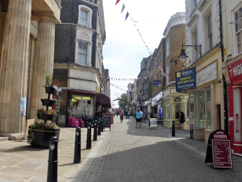 Zoals gezegd gaan we als een speer naar Harwich. Daar zijn we natuurlijk veel te vroeg voor de boot naar Hoek van Holland. Bert stelt voor om nog een keer fish and chips te eten. Bordjes geven de fietsroute aan naar de ‘historische binnenstad’. Eigenlijk zien de paar winkelstraten van Harwich er nogal vervallen uit. Het zijn dezelfde paar straten waar we op dag 1 geld pinden. ‘Historische binnenstad’ is wel een erg fraaie benaming voor het oude stadscentrum.