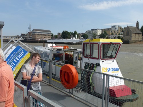 Het stel uit Limburg van gisteren had gelijk. We krijgen met aardig wat heuvels te maken als we de kant van de Theems op fietsen. In Gravesend willen we met de ferry over. Het betrekkelijk kleine bootje komt net aanvaren. We moeten echter ongeveer een uur wachten, want ze hebben net hun middagpauze. Daarom lopen we met de fiets aan de hand de winkelstraat van de oude stad in en nemen een salade van de dag bij een eettentje. Terug gaan we, tegen de verkeersregels in, fietsend naar beneden.