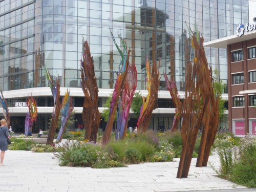 In Enschedé is een doorgaande route voor fietsers gemaakt naar het centrum. Auto’s zijn hier te gast. Bij het Hendrik Jan van Heekplein zijn we aan de rand van het centrum. Het is markt vandaag. De eerste druppels regen komen uit de lucht. Met behulp van Google Maps vinden we eenvoudig ons hotel. Het ligt anderhalve kilometer uit het centrum. We denken de hele middag te moeten schuilen voor het noodweer wat voorspelt is. Echter het valt allemaal wel mee hier in Twente. We gaan te voet terug naar het stadscentrum om wat rond te kijken en te eten. Als er een klein buitje regen over komt, bezoeken we hier het voormalige V&D-pand van deze stad. Net als in Arnhem zit hier nu een ander winkelbedrijf in. Deze winkel, Die Grenze, lijkt wat op een Action. Veel prullaria.