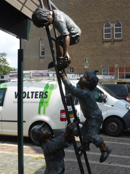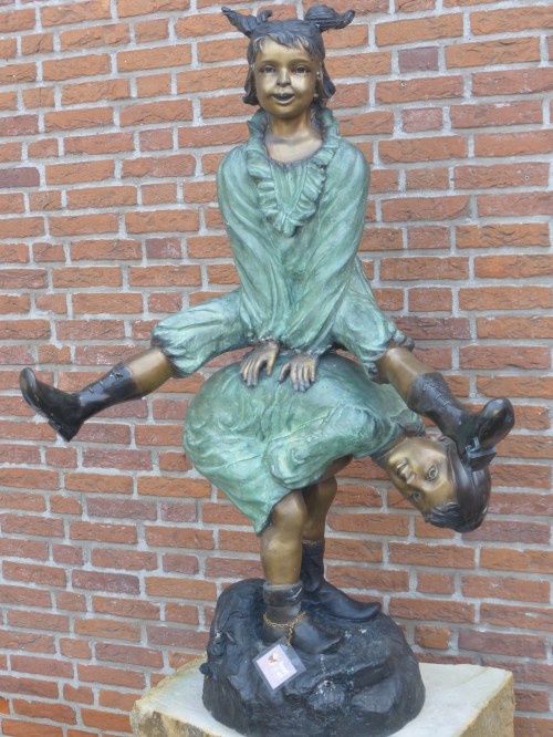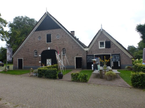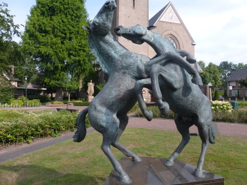In Geesteren staat voor de kerk een beeld met stoeiende paarden. Twee dagen gelden kwamen we ook al door een dorp met deze naam. Dat dorp ligt echter in Gelderland en nu zijn we in Overijssel. Tegenover de bakkerswinkel is een fabriekswinkel van Ten Cate/ Tweka.