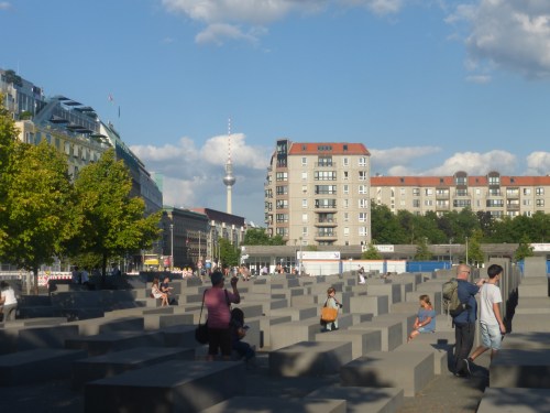 Nadat ik me heb opgefrist ga ik een wandeling door Berlijn maken. Van Joke had ik een boekje meegekregen met wat uitgestippelde routes. Het lijkt me het beste als ik toch maar mijn eigen route bedenk. Eerst ga ik de kant op van station Potsdammerplatz. Ik kom langs het monument opgericht voor de Joodse slachtoffers. In de verte is de Fernsehturm zichtbaar. Mijn avondeten nuttig ik bij een Indiaas restaurant.