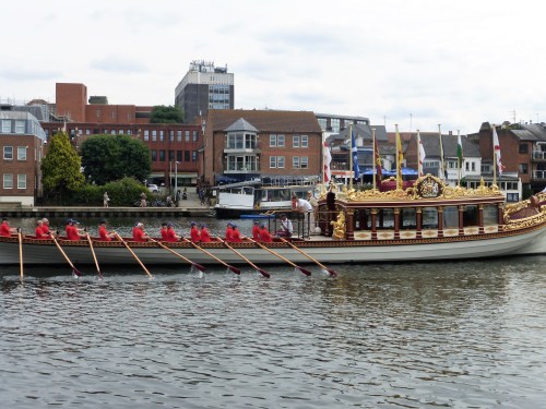 In Kingston wordt een botenparade gehouden. Een groot aantal simultaan roeiende mannen bevaart een soort gouden koets te water. We zien een stukje verderop op het pad langs het water een glimmende zwarte Mercedes met een chauffeur staan die duidelijk staat te wachten op een hotemetoot. We vragen hem of die auto van de koningin is. Dat blijkt niet het geval. De auto is van de burgemeester van de deelgemeente Kingston.