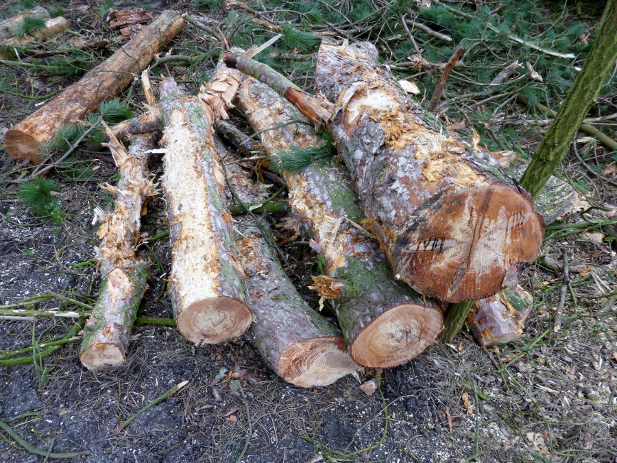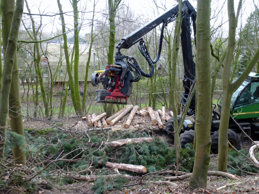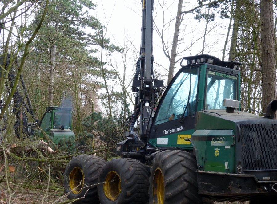 In de Noordwijkse duinen in de buurt van Noordwijkerhout zijn houtvesters bezig het duin te ontdoen van veel dennenbomen. Deze horen eigenlijk niet thuis in het Nederlandse boslandschap. De bomen worden vanuit een cabine omgezaagd, van zijtakken ontdaan en in stukken gezaagd door bosoogstmachines.