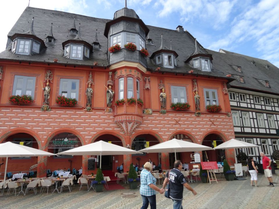 Holzminden ligt aan de Weser. Op de Grote Markt vinden we een plaats op een terras voor de warme maaltijd en een potje bier. Een Lederhosen-orkest speelt muziek op de kop van het plein.